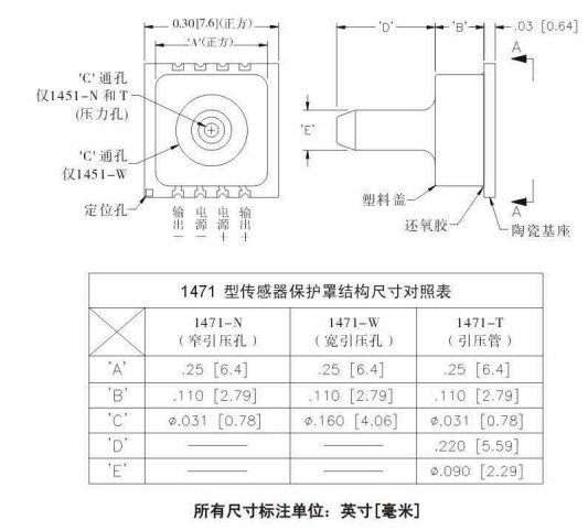 1471型表面貼裝硅壓阻式傳感器適用于大批量,體積小,重量輕,可進行自動化貼裝的應用領域。傳感器有表壓或絕壓兩種類型,且被粘貼到可進行表面焊接的陶瓷基座上。陶瓷基座上的保護罩一方面可以保護傳感器芯片,另一方面可提供引壓接口。該器件使用了防靜電塑封包裝管裝載,適用于自動化生產(chǎn)設備。圖示為一個標準型號,引壓管可根據(jù)截至需要選擇寬型或窄型兩種形式。