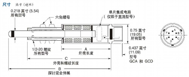 GCA/GCD系列測量頭有交流和直流兩種類型。AC型配合外部信號處理儀器使用(請參見本產品目求的“檢測儀器“章節);DC型的外殼中封裝了鐵芯、LVDT和所有必要的電子元件。通過使用表面貼裝單片電路縮減了傳統AC型的激勵電壓、放大和解調等電子元件所需的大部分體積、重量和成本。