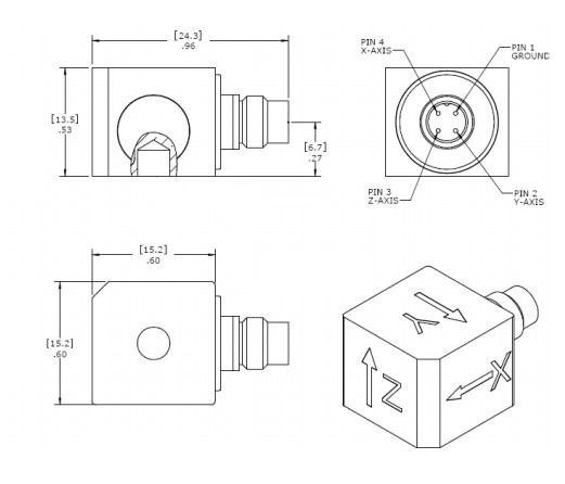 特點:4針電氣連接、寬頻響應,可達12KHz、粘合劑或螺釘安裝、小型三軸、環形剪切壓電陶瓷晶體、穩定溫度響應、應力消除