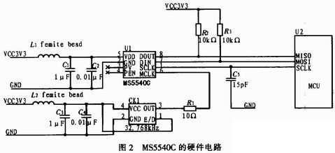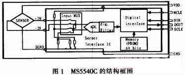 圖1是MS5540C的框圖結構。它具有引腳少接口簡單的特點。MS5540C供電電壓為2.2~3.6 V,與處理器的通訊接口為SPI串行接口,另外還需要一個32.768 kHz的時鐘輸入到MCLK引腳。