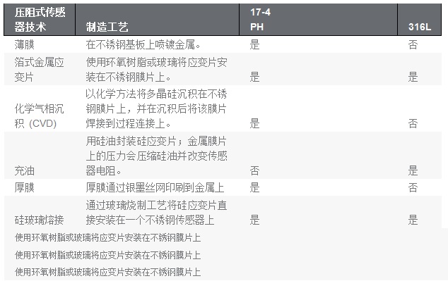 所使用的技術是一個重要因素。某些技術可用于的材料是有限制的。膜片所用的應變片應與其所用于的材料的熱屬性相匹配。17-4 PH 不銹鋼的平均熱膨脹系統為 6.0 x 10-6 in/in/°F,采用 H900 熱處理,而 316L 的范圍約為 9 至 11 x 10-6 in/in/°F。諸如薄膜等技術只能用于 17-4 PH,因為膜片的噴鍍流程溫度太高。 概括而言,傳感器材料和技術的差異對于壓力傳感器的選擇可能起到至關重要的作用。應該熟悉有關所測量的液體或氣體及其應用的信息,以選取更好的材料。如果 17-4 和 316L 都不能滿足需要,可以提供特殊的合金。