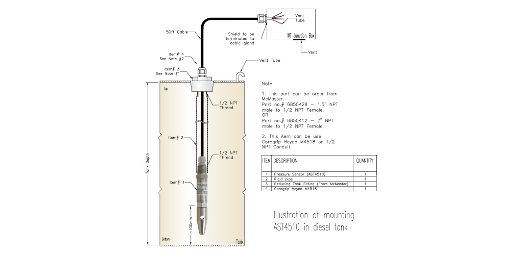 在考慮如何安裝投入式壓力傳感器時,需要考慮多種不同的因素。下面的圖示顯示了在儲罐內(nèi)使用剛性管安裝 AST4510 投入式壓力傳感器的一種方法。AST4510 在電纜連接基板提供了標準的 1/2" NPT 公端導管連接。如果儲罐內(nèi)因采用入口/加注管或使用攪拌器而使液體涌動,可以為傳感器的電纜安裝剛性塑料或金屬導管,以防傳感器在儲罐內(nèi)移動。在船運、鐵路運輸?shù)纫苿討弥校蛘咝枰诓煌攸c之間運輸儲罐時(例如施工場地使用的燃油儲罐、用于工業(yè)處理的化學品容器或井場注入化學品),這種形式最為常見。
